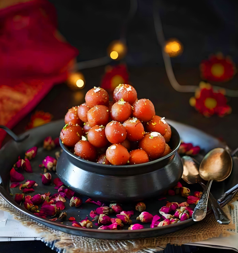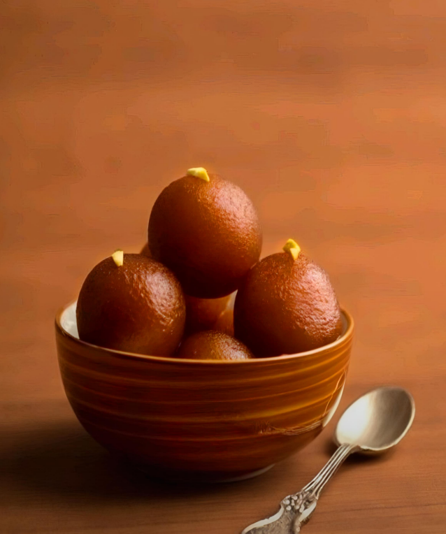 fried dough balls made from milk solids and semolina are soaked in a syrup flavoured with cardamom, rose water, saffron. (Contain: Milk,Gluten, Ghee)