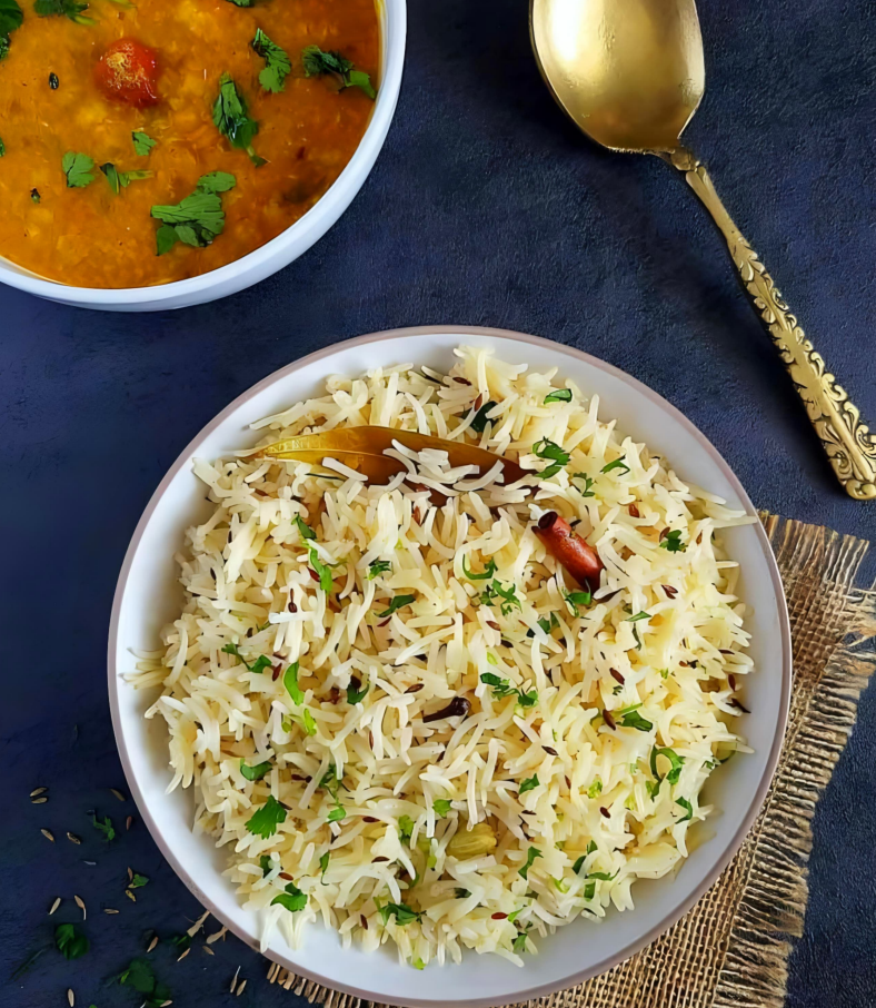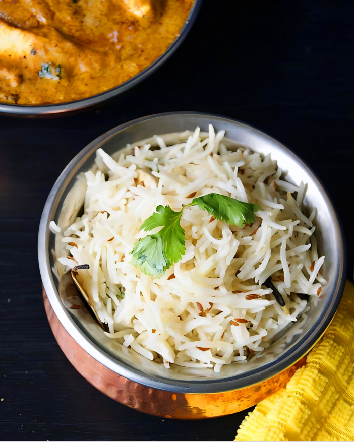 a popular steamed rice dish having the flavour of cumin that’s easy to make and goes well with any Indian side dish or gravy. (Contain Ghee)