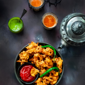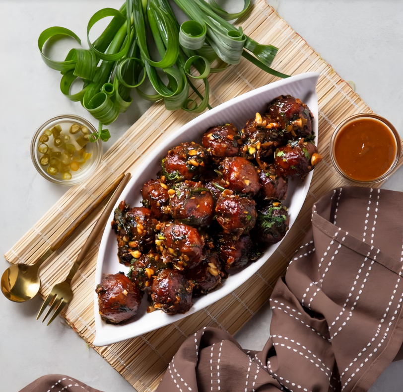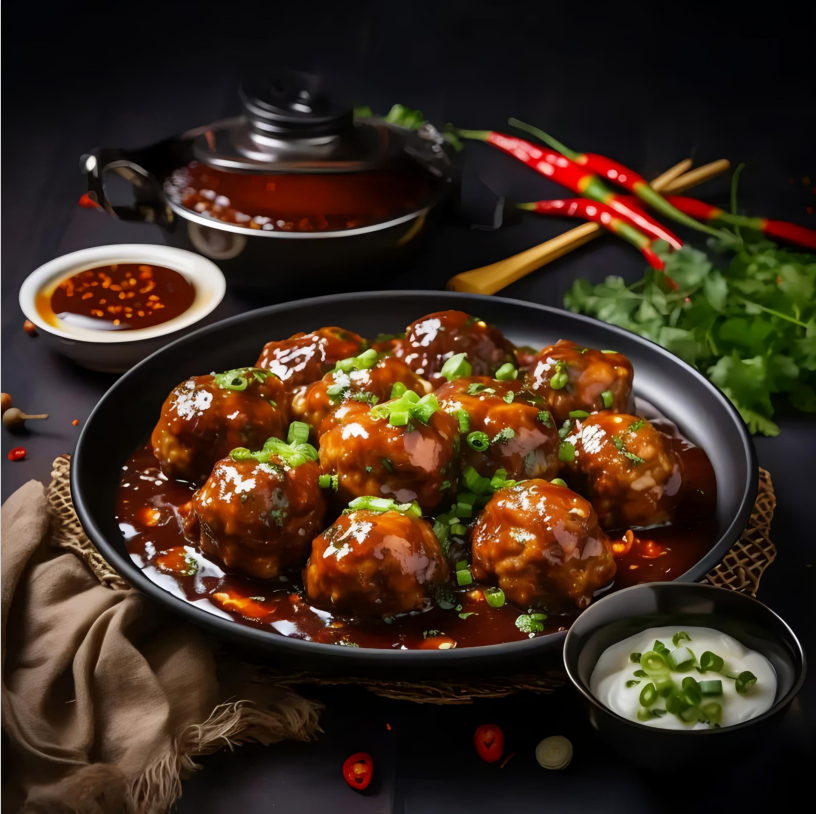 a popular Indo Chinese appetiser made of fried mixed veg balls in Manchurian sauce (Contain: Wheat, Soya)